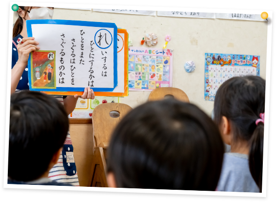 - 毎月外部から専門講師を招いての英語教室(ABCタイム)、音楽あそび(リトミック)、お花教室に参加し、豊かな感性を育てます。